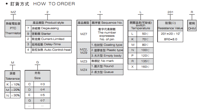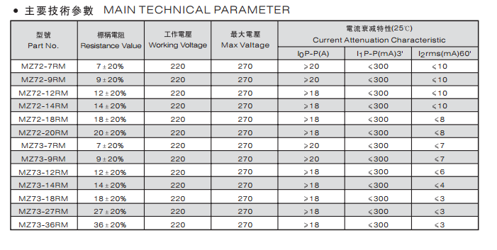PTC熱敏電阻器:是一種以鈦酸鋇為主要成分的半導體陶瓷元件,當溫度增加到居里溫度以上時,其電阻值呈階躍式增加,可達到4~10個數量級。它具有電阻值隨溫度的增加而增加的特性。其中MZ2型熱敏電阻器由于過流保護作用而用于通訊及交流電路中。MZ3型熱敏電阻器具有延長燈絲壽命及節約能源而用于電子節能燈及電子鎮流器,用于數字式萬用表中作過流保護元件、交流電路中過熱保護。MZ9型馬達啟動熱敏電阻器可作為無觸點開關用于制冷設備的壓縮機及大功率馬達中。MZ7型消磁電路用熱敏電阻器,在彩色電視機和彩色顯示器作自動消磁元件,