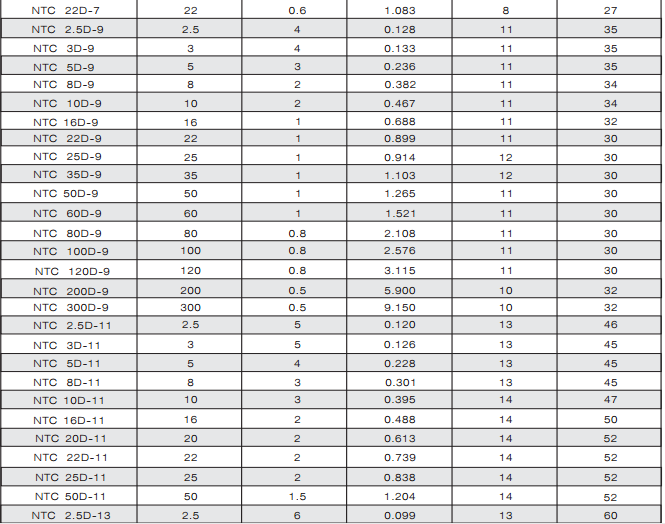 NTC熱敏電阻器:是以錳、鈷、鎳和銅等金屬氧化物為主要材料,采用陶瓷工藝制造而成的。NTC熱敏電阻器在室溫下的變化范圍在10°歐姆~10⒍歐姆,溫度系數-2%~-6.5%。它具有電阻值隨溫度的上升而下降的特性。適用于轉換電源、開關電源、UPS電源、各類電加熱器、電子節能燈、電子鎮流器、各種電子裝置電源電路的保護以及彩色顯示管、白熾燈及其他照明燈具的燈絲保護。