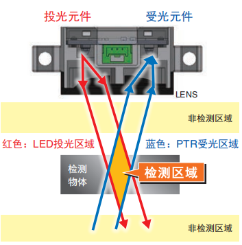 歐姆龍新推出傳感器B5W(原理如圖)是一款不易受顏色和材質影響的限定反射型。 鏡面、黑色、透明物體也都會檢測出來限定位傳感器,檢測范圍廣,因此耐物體位置偏移強不易受外部干擾影響。接受來自檢測物體的反射光以檢測物體有無,擁有限定了投光光束和受光區域的光學系統。支持DC24V的設備內置用,憑借由4種超環面透鏡組成的歐姆龍自行設計的結構,只需微弱的光即可實現穩定檢測。