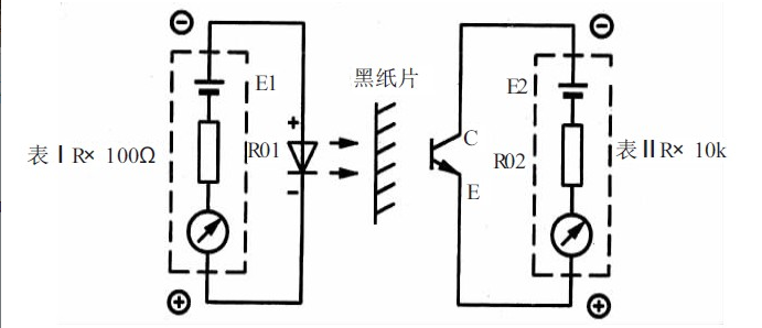 檢測原理:接通電路后,發(fā)射管即發(fā)出紅外線,接收管則產(chǎn)生光電流,使c-e 極間電阻從無窮大降至幾百千歐。當黑紙片擋住紅外線時,接收管就無光電流,電阻值迅速增大。因此上、下抽動黑紙片,可不斷改變表Ⅱ的讀數(shù),觀察到指針的擺動。