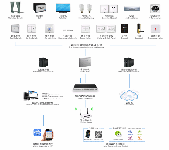 客房智能控制主機、客房控制面板和客房管理軟件三部分組成客房智能控制系統,并可以根據客戶需求自由組合和擴展模塊。通過弱電控制強電的方式,實現對照明、排氣扇、空調、窗簾、音視頻及服務信息等功能控制。采用TCP/IP協議或CAN-BUS總線組網,能夠實現遠程管理與控制,還可以與蘋果(IOS)、安卓(Android)系統的移動終端設備無縫連接,可由移動終端設備進行控制,為客房營造典雅、溫馨、舒適的環境,實現酒店的智能控制、綠色環保和高效管理。