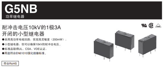 歐姆龍G5NB是一款耐沖擊電壓為10kV的1極3A/5A開閉的小型繼電器,該器件采用了高功率電磁回路,能夠實現高達200mW的靈敏度。并且歐姆龍G5NB繼電器已經取得了UL、CSA、VDE認證,產品用途符合EN61010強化絕緣標準。