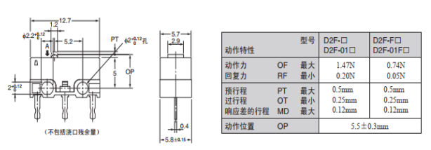 歐姆龍微動開關D2F-F優勢:超小型,性能穩定,動作力只需要0.74N,能夠更精準地感應剎車片磨損的程度,為風力發電機的安全運作提供給更有力的保障,以下是D2F-F的尺寸圖和動作特性。