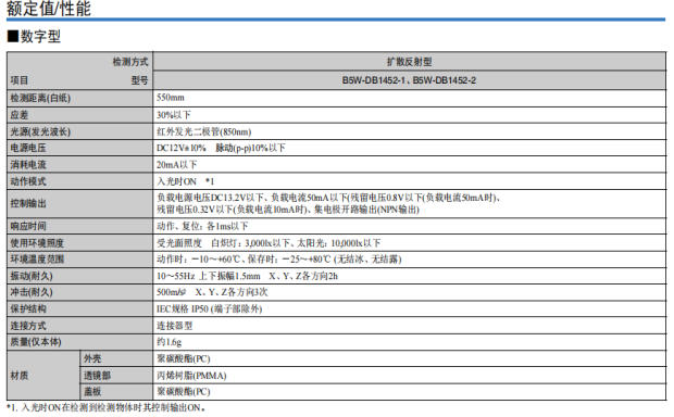 歐姆龍B5W-DB的光源為紅外發(fā)光二極管(850nm),受光面照度在白熾燈的情況下為3,000lx以下、太陽光的照度下為10,000lx以下。不僅如此,B5W-DB的外殼采用聚碳酸酯(PC)、透鏡部采用丙烯樹脂(PMMA)、蓋板采用聚碳酸酯(PC)材質(zhì),保護(hù)結(jié)構(gòu)符合IEC規(guī)格IP50標(biāo)準(zhǔn)(端子部除外),可幫助設(shè)備實(shí)現(xiàn)強(qiáng)耐用性。