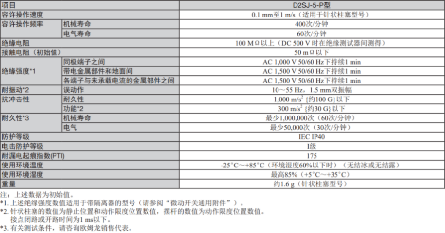 歐姆龍D2SJ擁有19.8mm×6.4mm×10.2mm的超小型封裝,和封密型輕觸開關一樣,歐姆龍D2SJ采用了防塵、防水措施,能夠在-25℃~+85℃(濕度環境60%以下)等環境惡劣中也保持較高的性能。除此之外,在環境溫度20±2℃ 、環境濕度65±5%RH、操作頻率30次/min的情況下,歐姆龍D2SJ最大可達250V的額定電壓,5A的阻性負載,適用于更廣泛的產品。