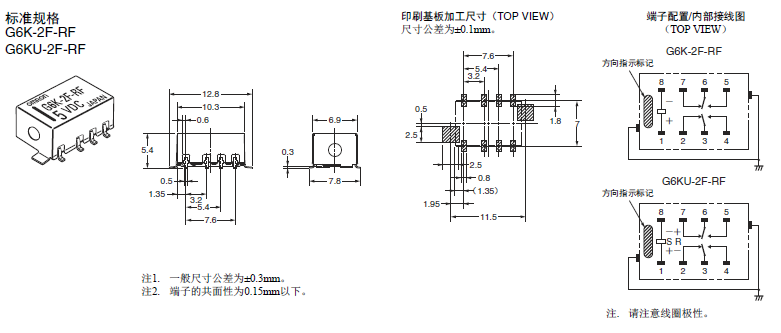 單穩(wěn)型 | 塑料密封型 | DPDT(2c) | DC 3, 4.5, 5, 12, 24 | G6K-2P-RF | 30件/根 |